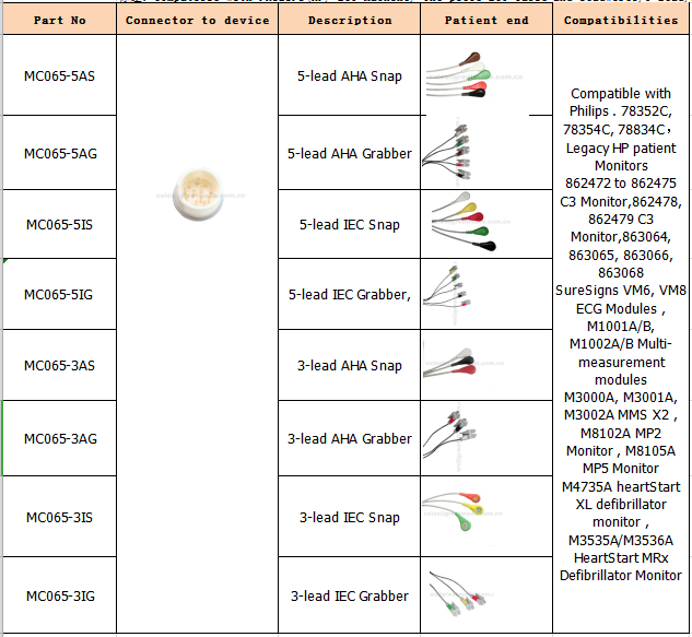 "ফিলিপসের সাথে সামঞ্জস্যপূর্ণ 78 78352 সি, 78354 সি, 78834C , লেগ্যাসি এইচপি রোগী 862472 থেকে 862475 সি 3 মনিটর, 862478, 862479 সি 3 মনিটর, 863064, 863065, 863066, 863068 শিওর সাইনস ভিএম 6, ভিএম 8 ইসিজি মডিউল, এম 1001 এ / বি, এম 1002 পরিমাপের মডিউলগুলি M3000A, M3001A, M3002A এমএমএস এক্স 2, M8102A এমপি 2 মনিটর, এম 8105 এ এমপি 5 মনিটর এম 4735 এ হার্টস্টার্ট এক্সএল ডিফিব্রিলিটর মনিটর, M3535A / M3536A হার্টস্টার্ট এমআরএক্স ডিফিব্রিলিটর মনিটর "